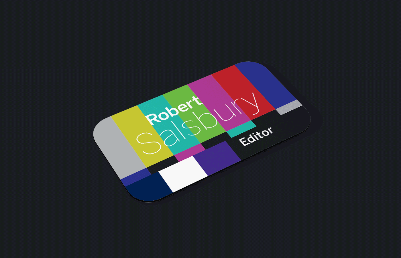 Robert Salsbury is a documentary film and TV editor in New York City. He needed his own identity/branding for his business cards, invoices, and reel. Learning that careful use of humor can be a powerful tool in documentary storytelling, I mixed a classic test pattern with a character I created based on a videocassette.