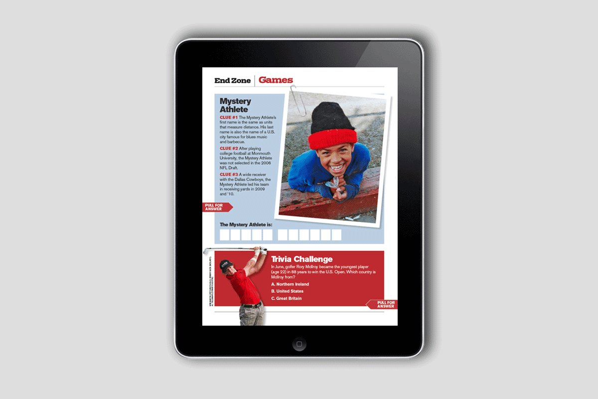 Sports Illustrated Kids is a Time, Inc brand which includes a magazine (circulation 650,000), a website, books, and apps. While their Senior Designer was on maternity leave, I worked on-site as part of the team designing layouts for the monthly print magazine and digital editions, designing web graphics, and completing a football activity book.